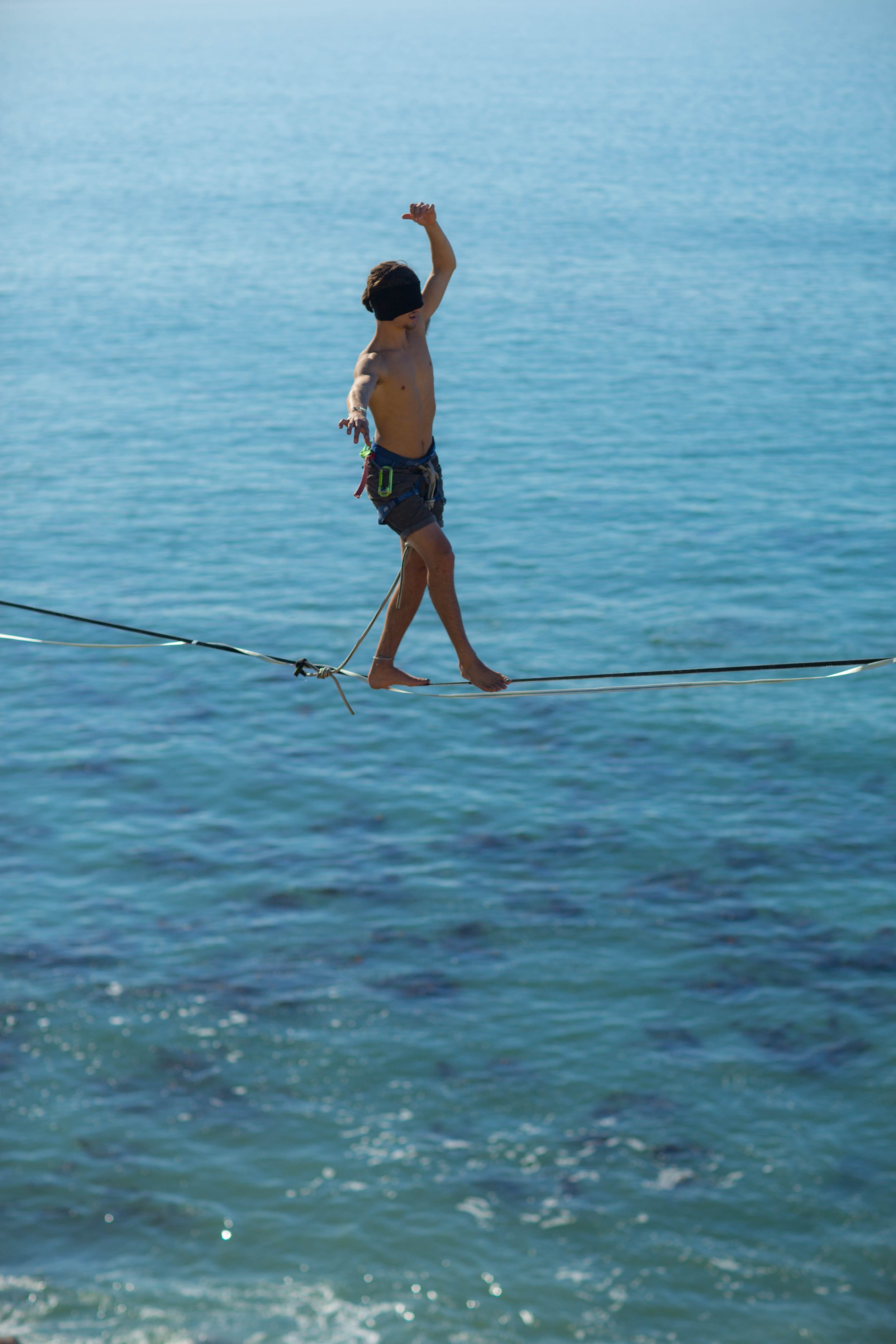 A slackline is a piece of flat webbing connected above the ground between two anchors that you walk across. Usually between two trees or at a designated slackline park like the one at Original Muscle Beach in Santa Monica