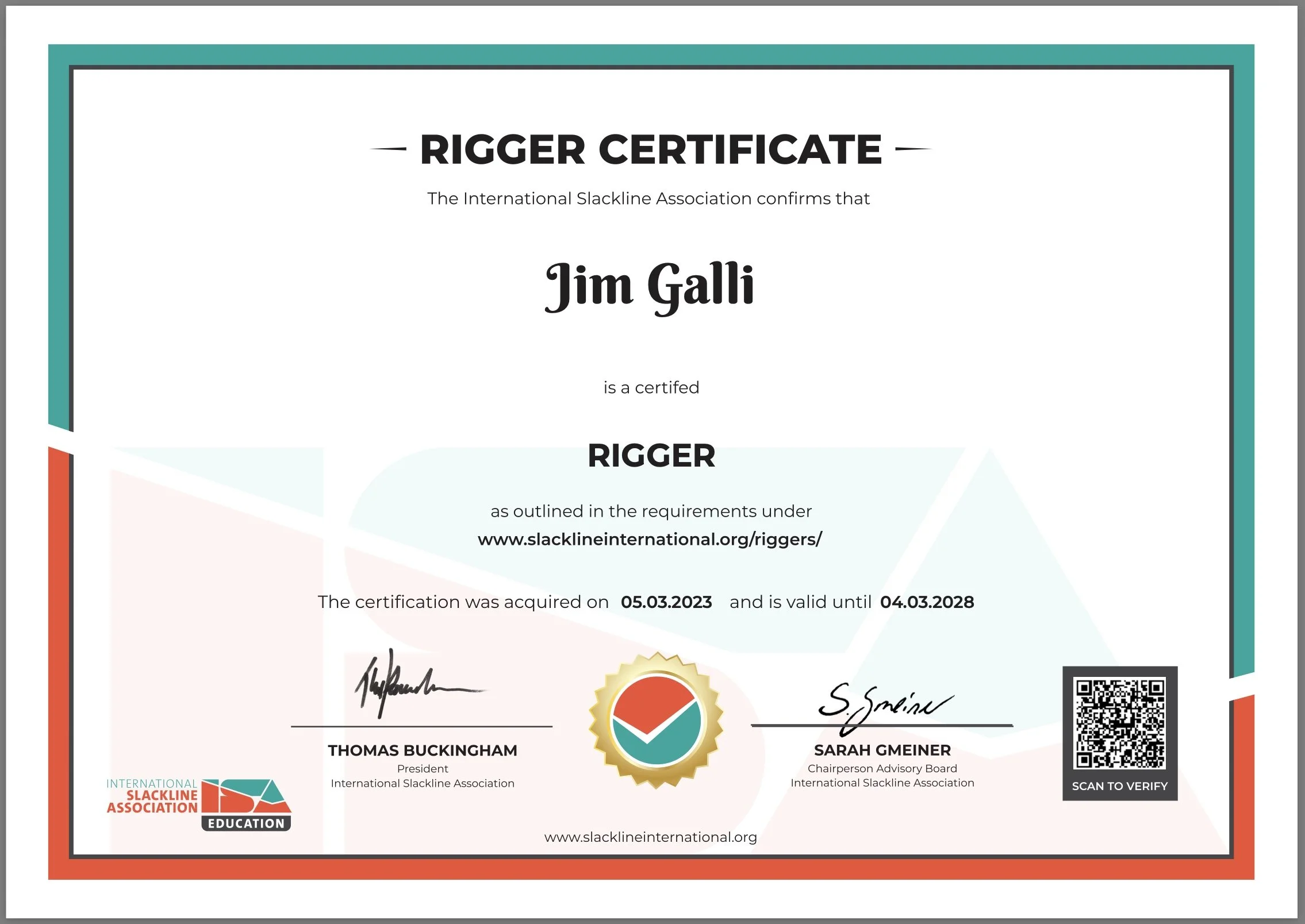 Now fully certified from the International Slackline Association (ISA) as a rigger, Jim is also a Rope Access Technician with an IRATA level 3 certification and SPRAT level 2.
